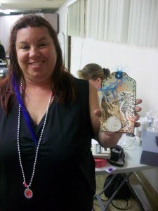 The lovely and oh so talented Margie Romney Aslett was there from Utah hosting the NSD crop and teaching some fantabulous classes over the weekend with her Girls Paperie line(holy cow is that an awesome line of goodies). OMG she made me laugh so hard, this girl is a hoot! Here she is getting her glimmer on.